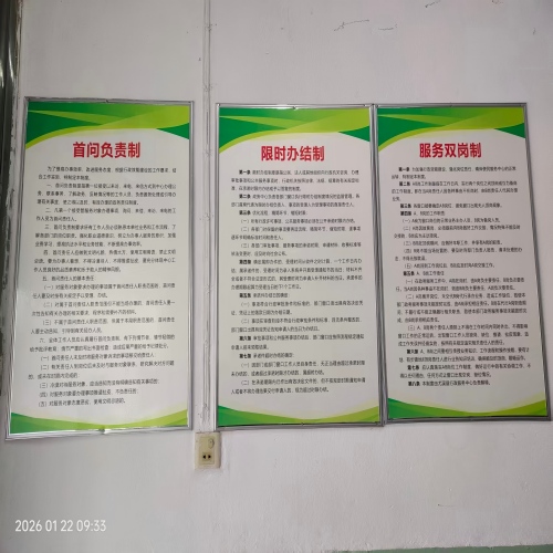 制度保障:墙上公示了首问负责制、一次性告知制、限时办结制、无否决权制、服务双岗制等工作制度,明确服务标准与流程,确保群众办事有章可循、权益有保障。