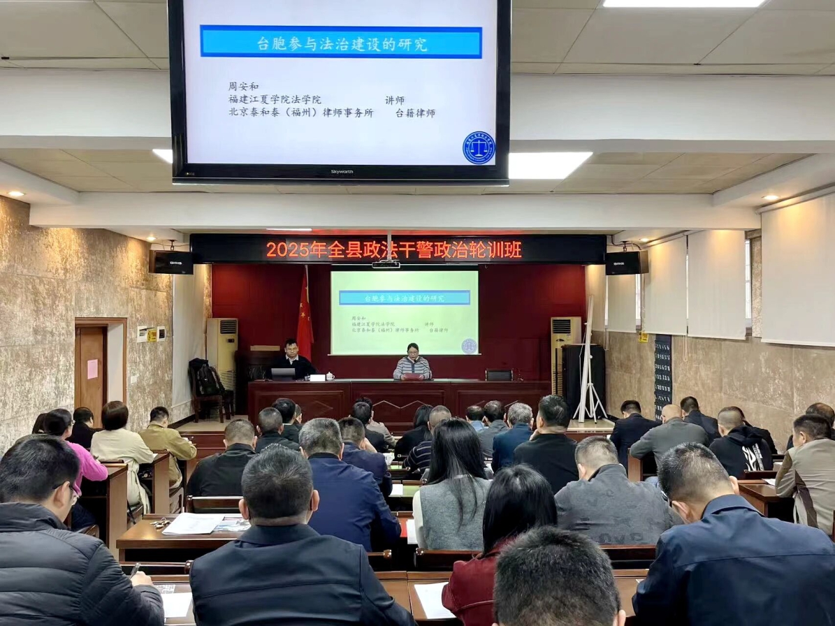 为深化两岸交流交融,充分发挥台胞在基层治理中的独特作用,强化政法干警法治素养和涉台法律事务专业能力,11月4日上午,尤溪县政法干警政治轮训班开班,福建江夏学院法学院讲师、尤溪县司法局法律咨询专家周安和老师应邀作《台胞参与法治建设的研究——以台胞调解员为例》专题讲座,为50余名政法干警授课。