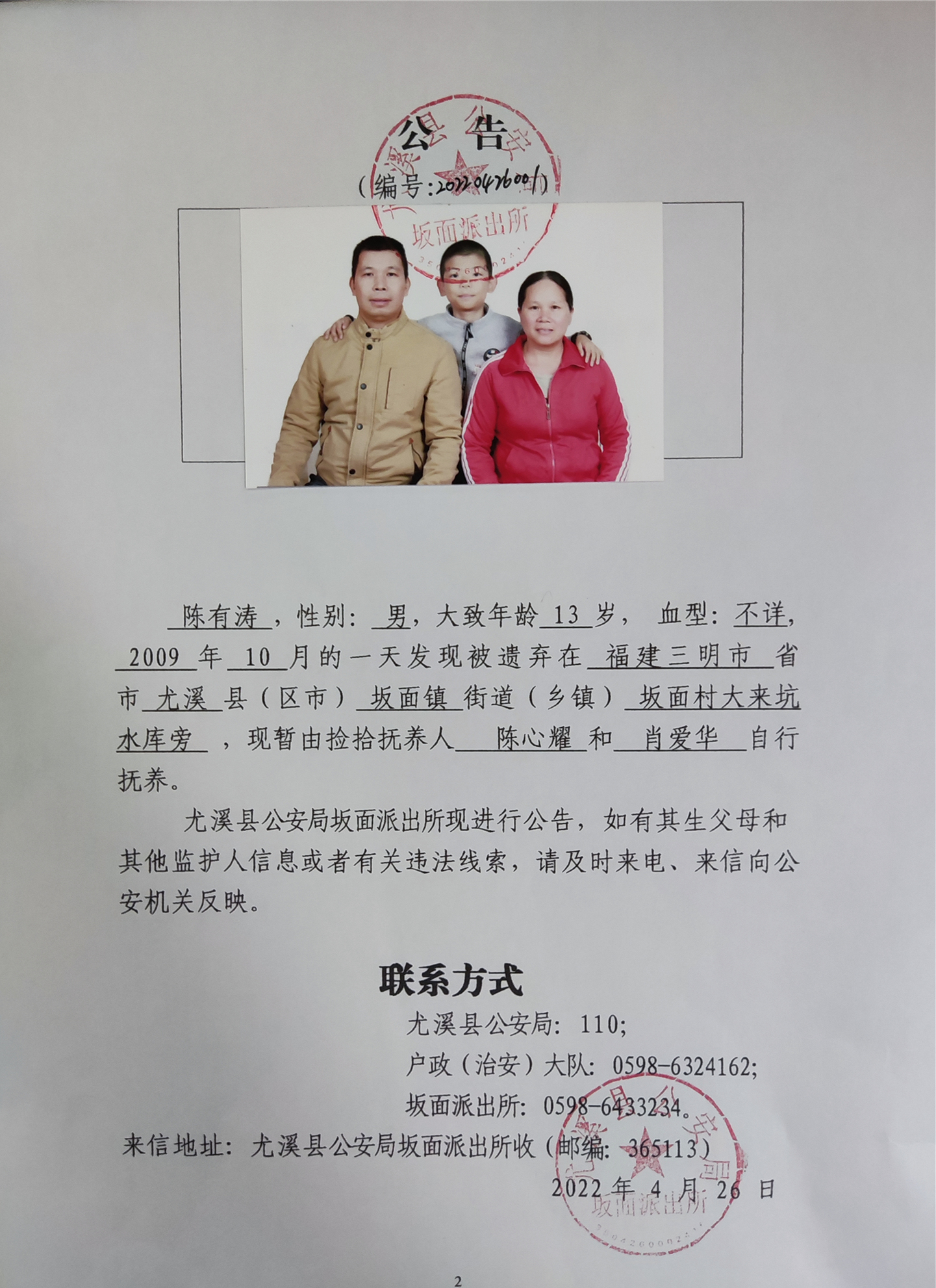 关于查找弃婴陈有涛亲生父母的公告(20220426)