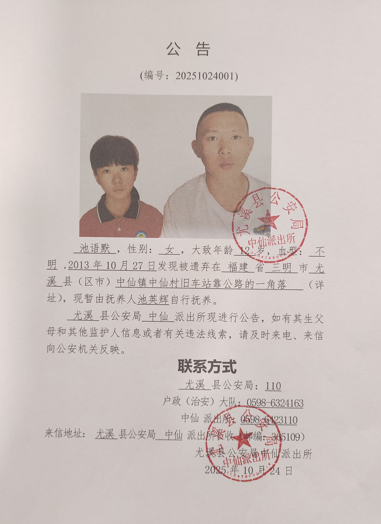 关于查找弃婴池语默亲生父母的公告