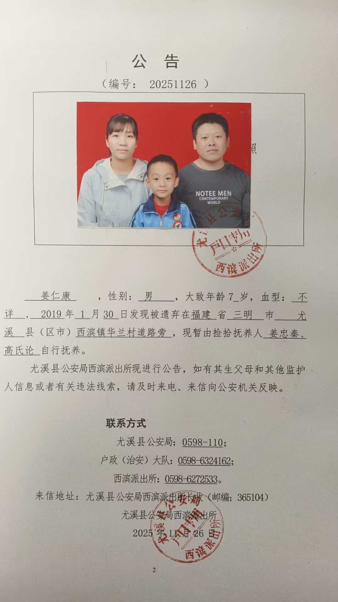关于查找弃婴姜仁康亲生父母的公告