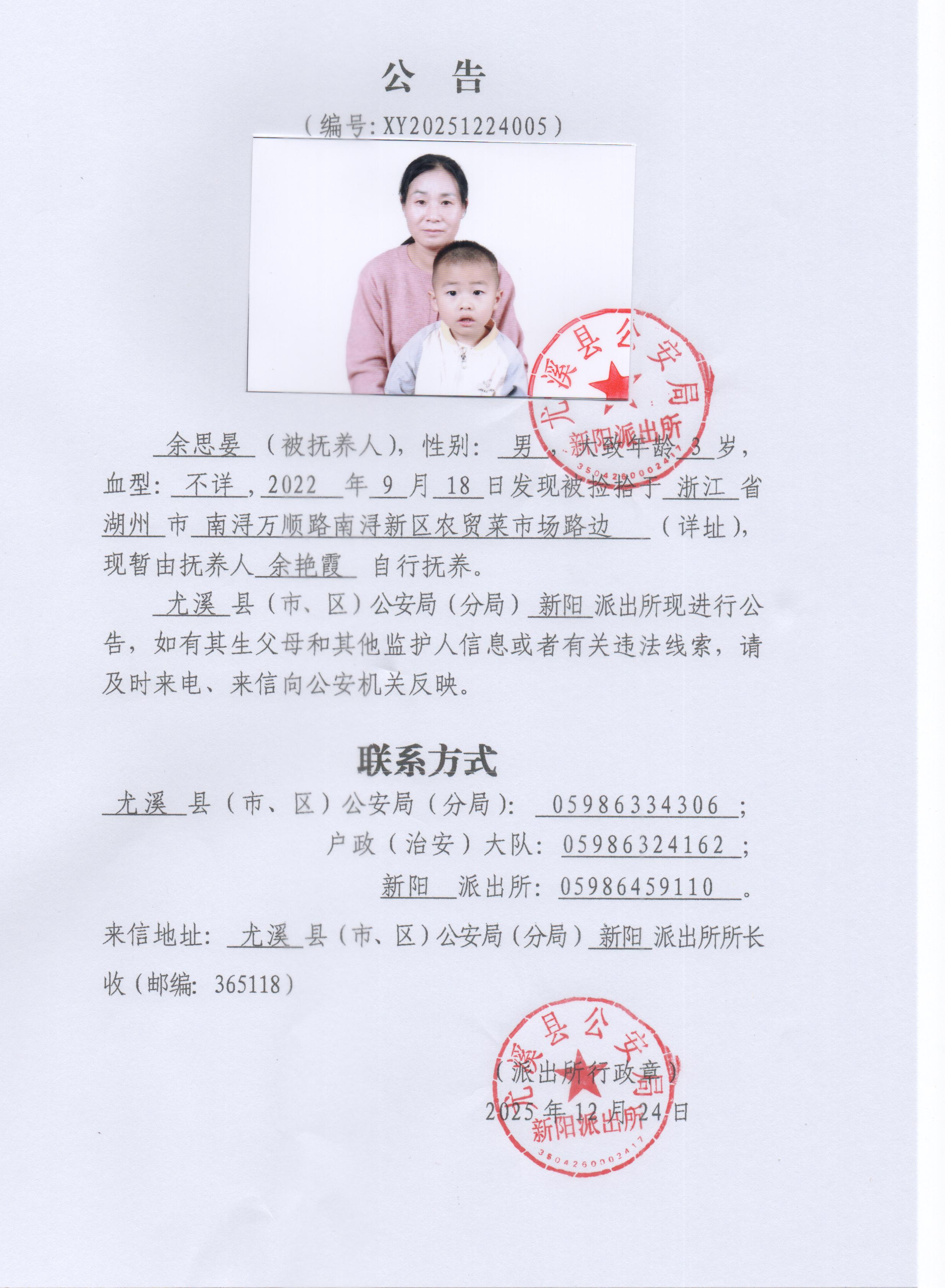 关于查找弃婴余思晏亲生父母的公告