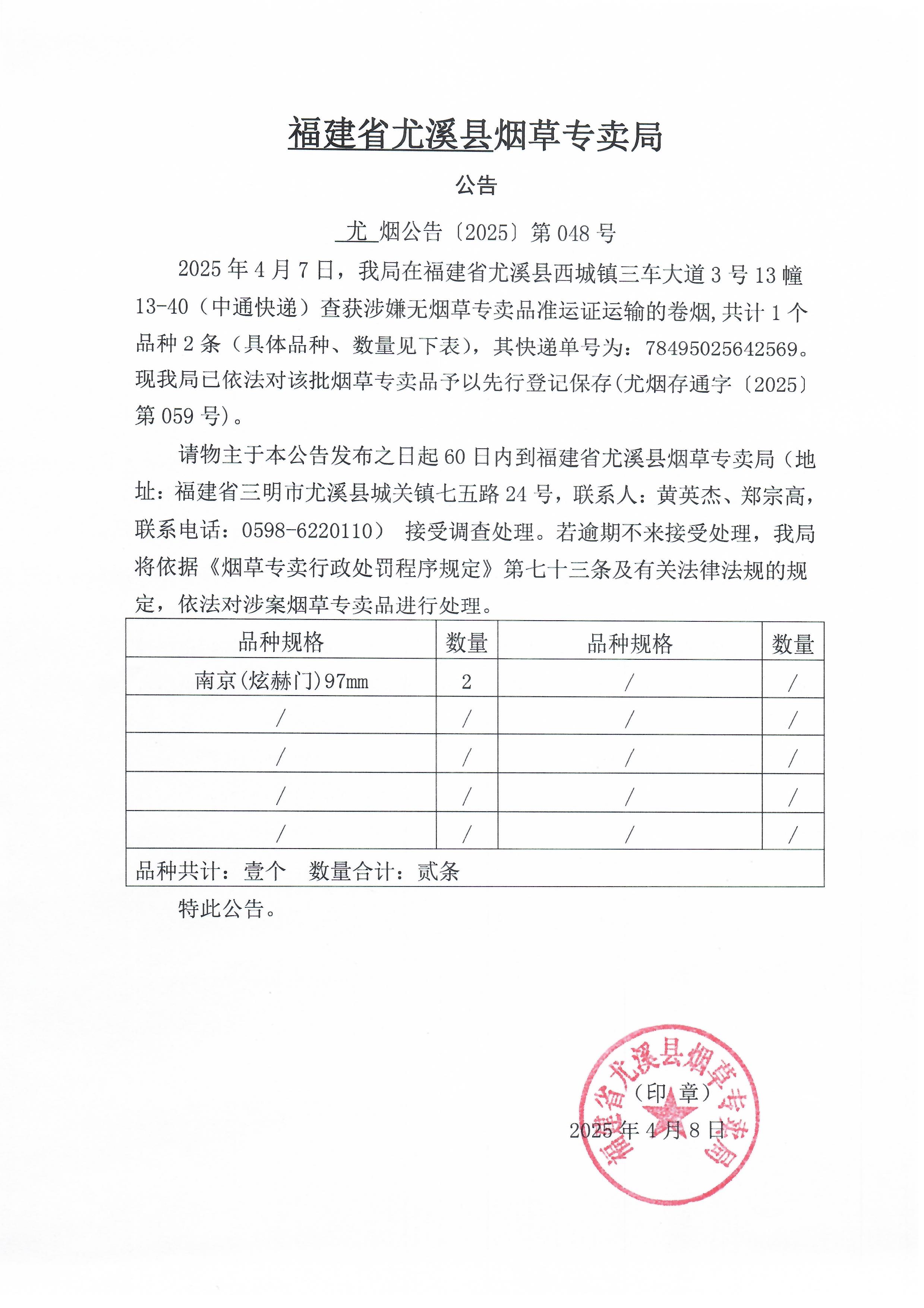 尤溪县烟草专卖局公告(20250410)