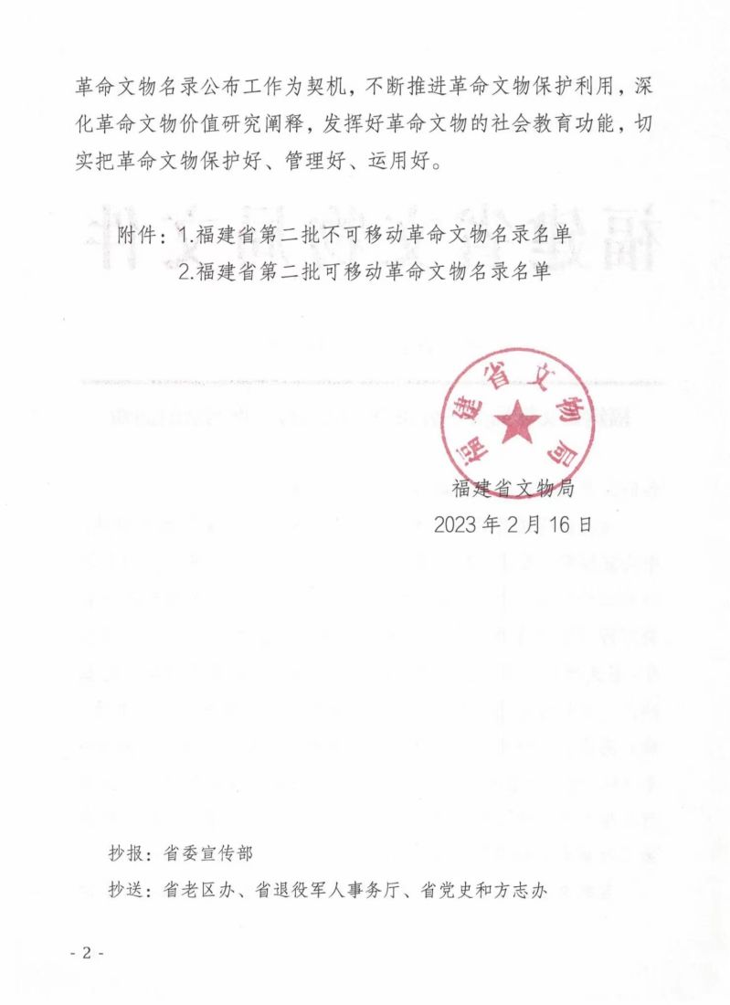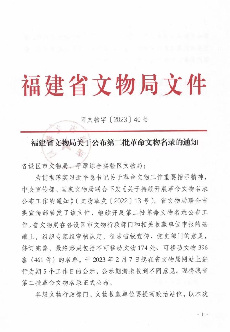 近日,省文物局印发《关于公布第二批革命文物名录的通知》(闽文物字〔2023〕40号),公布了全省第二批不可移动革命文物共174处、可移动文物396套(461件),我县共有5处不可移动革命文物入选,均为县级文物保护单位。截至目前,我县共有省级不可移动革命文物28处、可移动革命文物共20件/套。