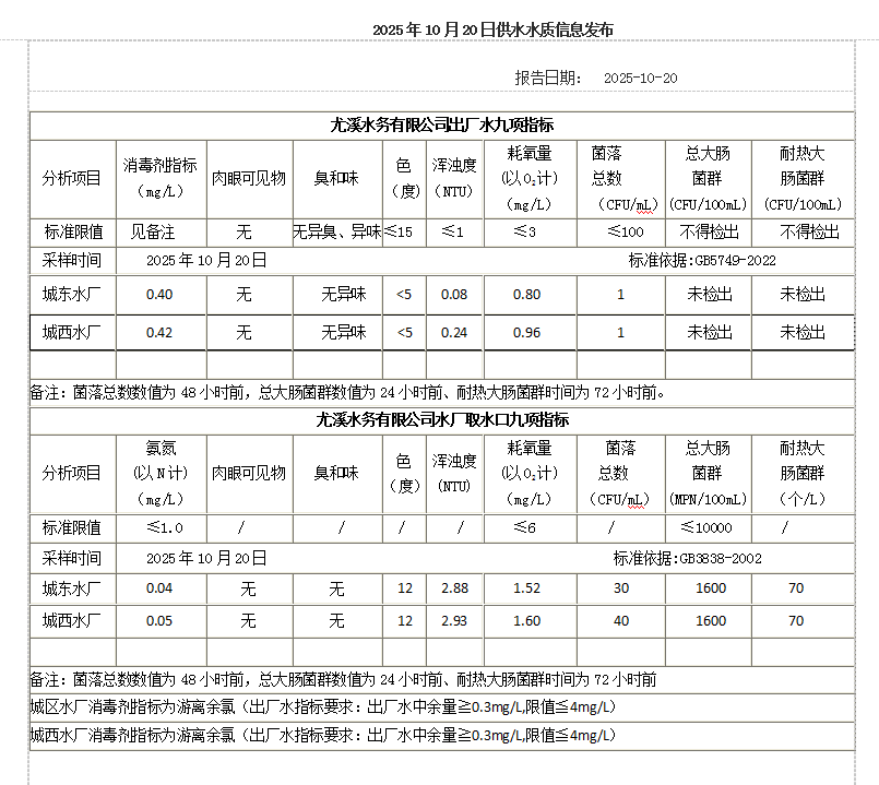 2025年10月20日供水水质信息发布