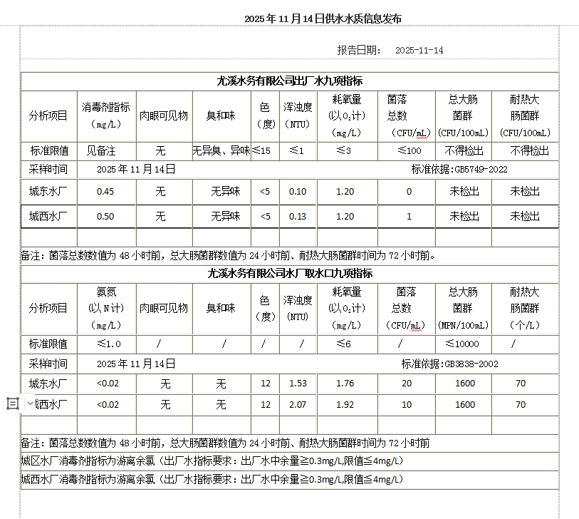 2025年11月14日供水水质信息发布