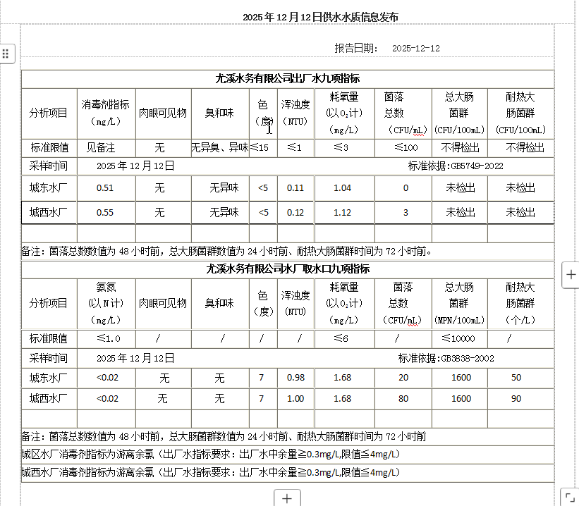 2025年12月12日供水水质信息发布