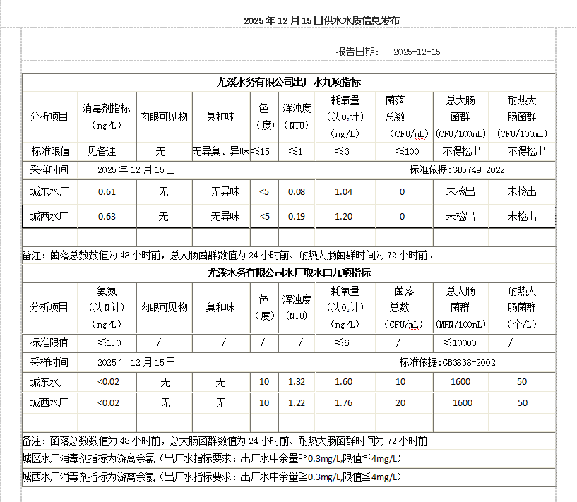 2025年12月15日供水水质信息发布