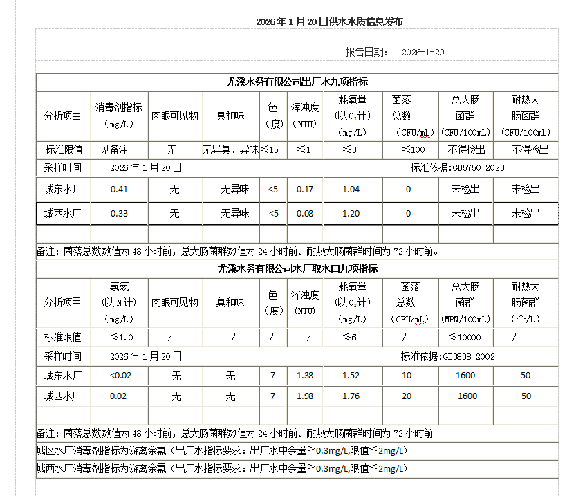 2026年1月20日供水水质信息发布