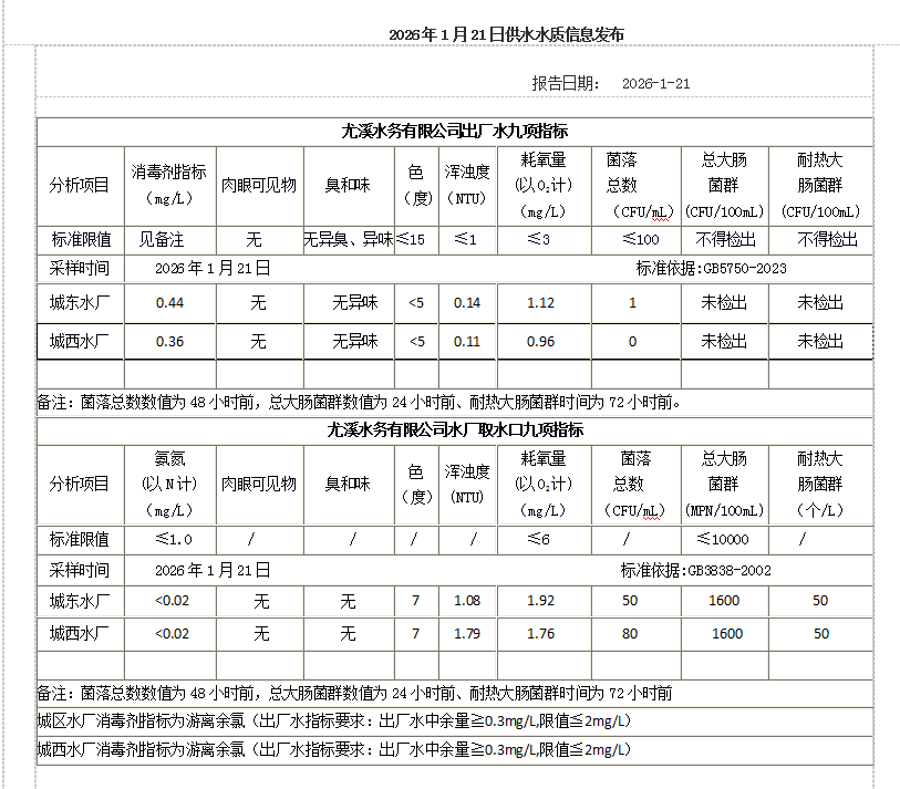2026年1月21日供水水质信息发布