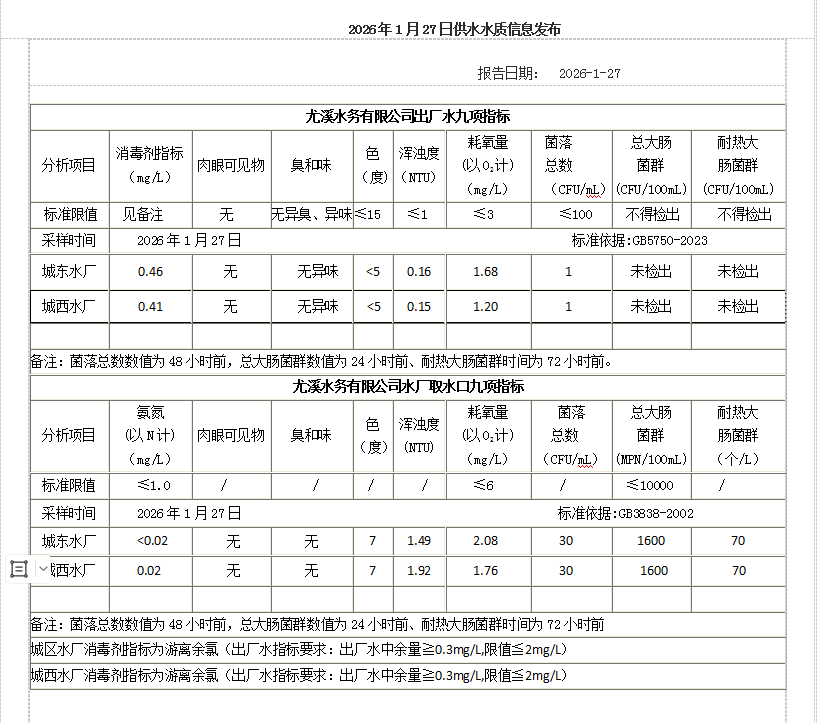 2026年1月27日供水水质信息发布