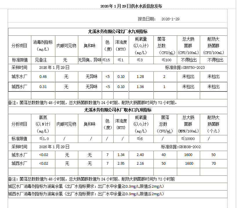 2026年1月29日供水水质信息发布