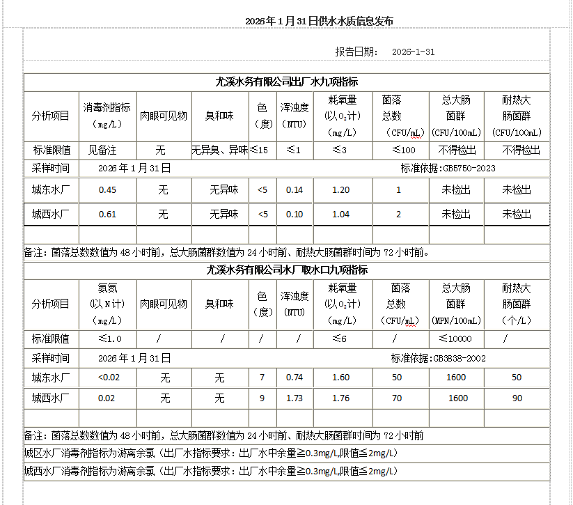 2026年1月31日供水水质信息发布