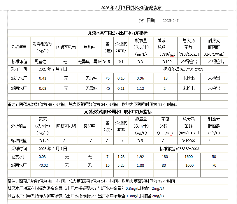 2026年2月7日供水水质信息发布
