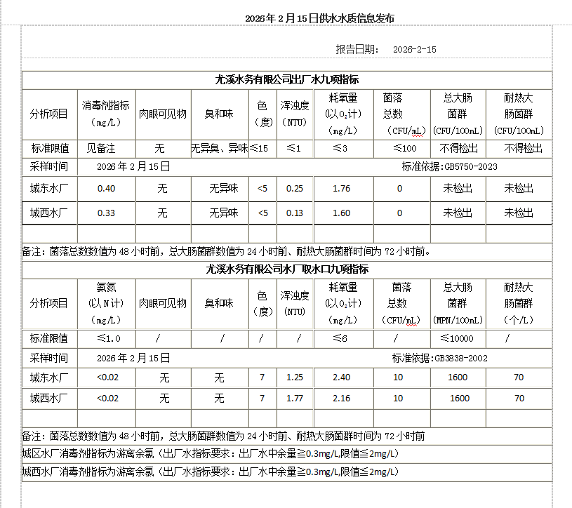 2026年2月15日供水水质信息发布