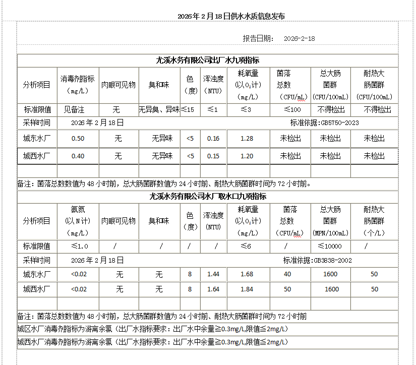 2026年2月18日供水水质信息发布