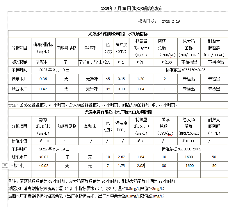 2026年2月19日供水水质信息发布