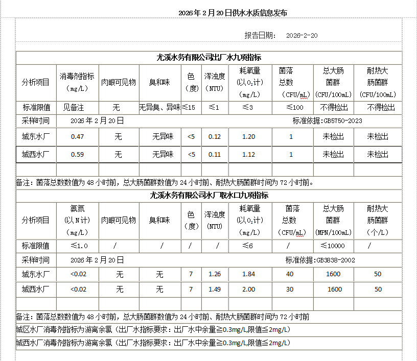 2026年2月20日供水水质信息发布