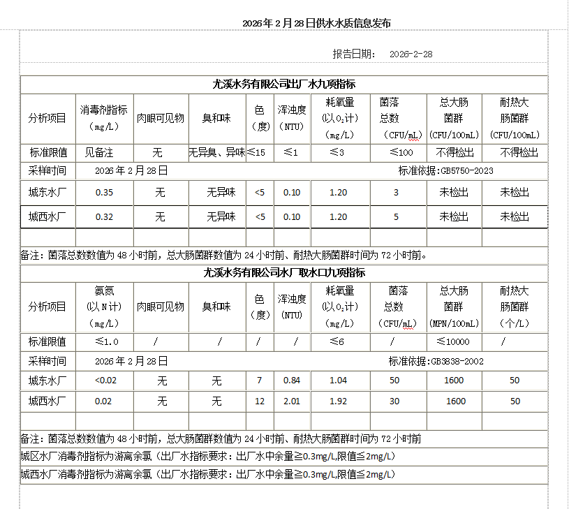2026年2月28日供水水质信息发布