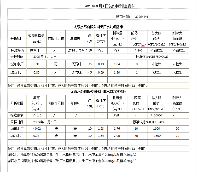 2026年3月1日供水水质信息发布