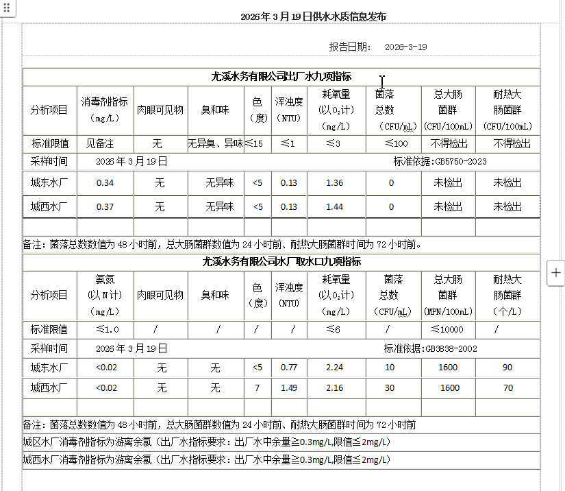 2026年3月19日供水水质信息发布
