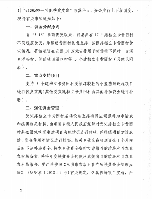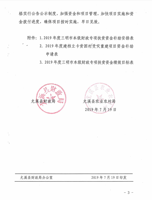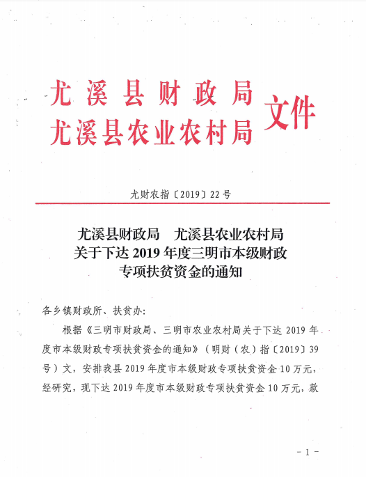 尤溪县财政局 尤溪县农业农村局关于下达2019年度三明市本级财政专项扶贫资金的通知