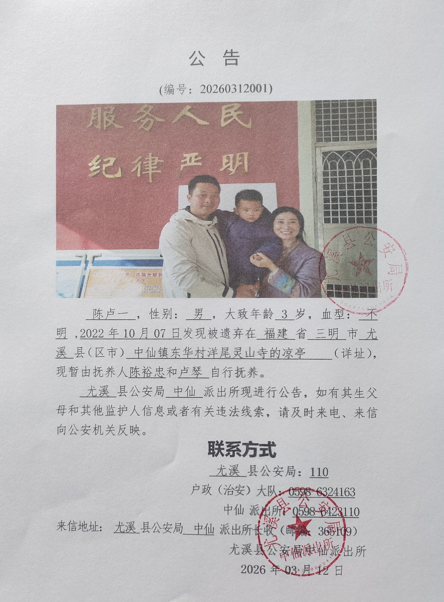 关于查找弃婴陈卢一亲生父母的公告