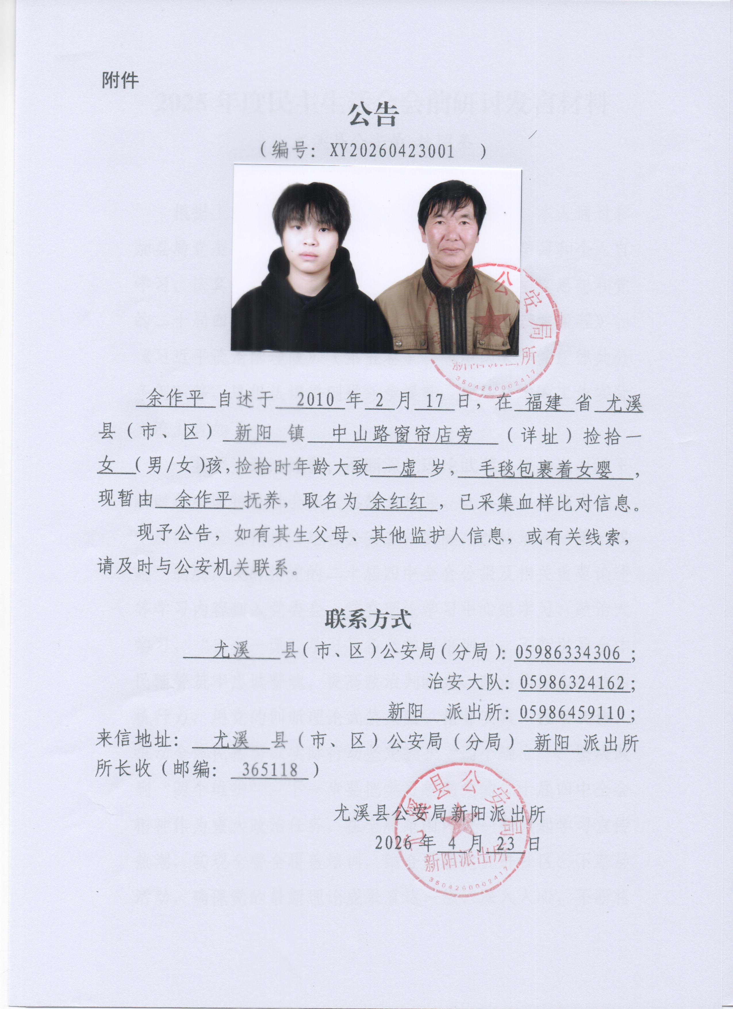 关于查找弃婴余作平亲生父母的公告