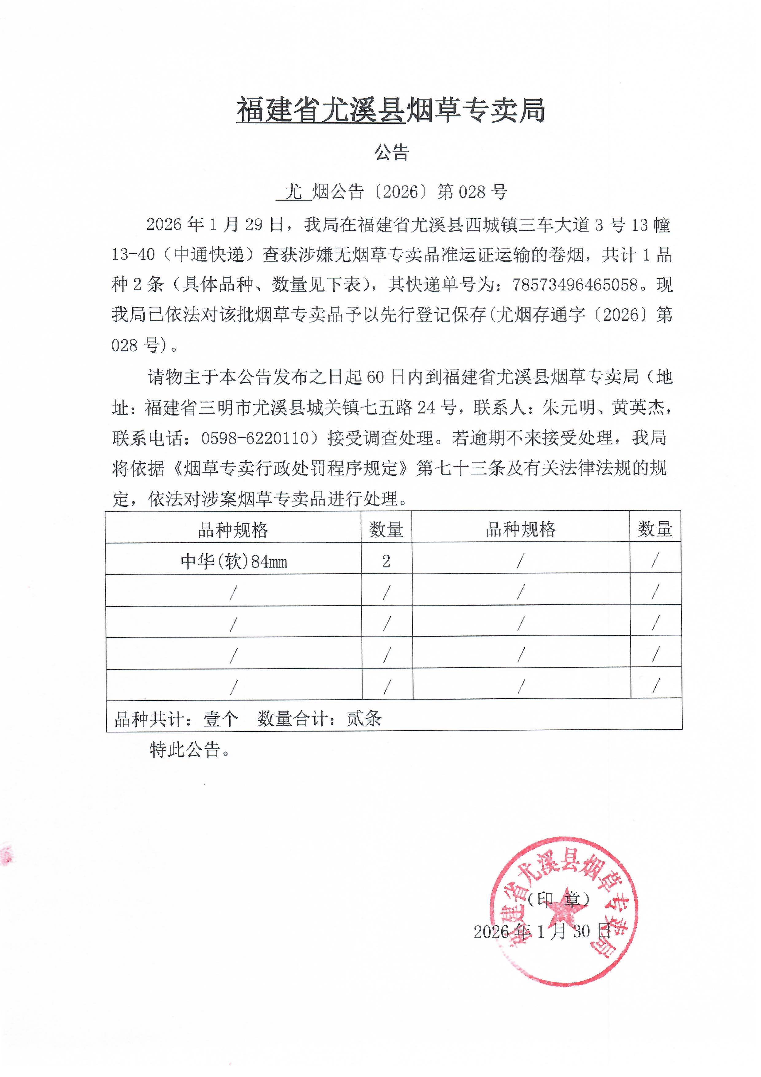 尤溪县烟草专卖局公告(20260130)