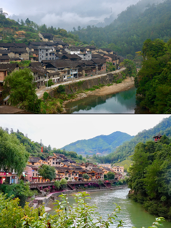 拼板照片:上图为2014年10月22日拍摄的宁德市寿宁县下党乡下党村村貌(新华社记者姜克红摄);下图为2023年8月5日拍摄的宁德市寿宁县下党乡下党村新貌(新华社记者林善传摄)。新华社发