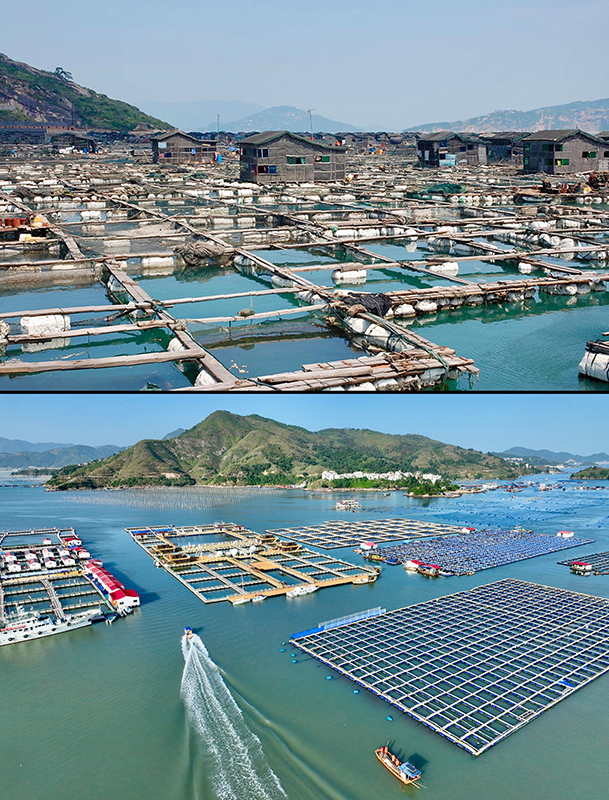 拼版照片:上图为2007年7月拍摄的福建宁德三都澳海域传统渔排(资料照片);下图为2023年11月18日拍摄的福建宁德七星海域升级改造后的渔业养殖区(无人机照片,新华社记者姜克红摄)。新华社发